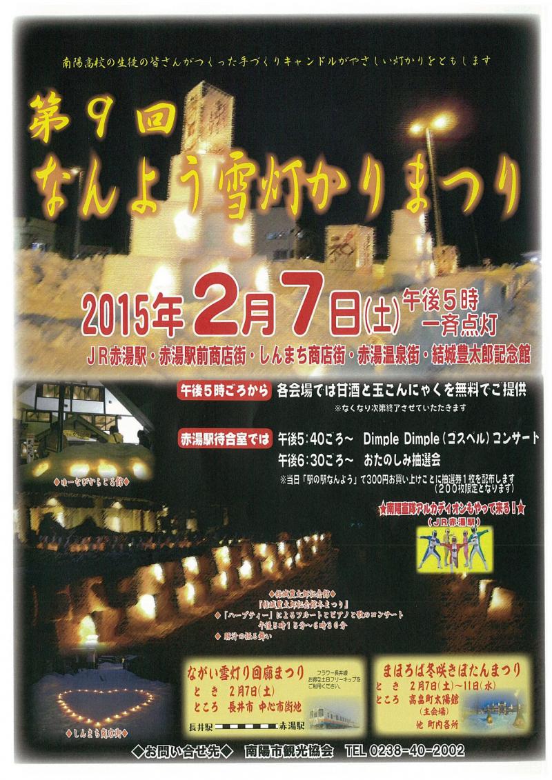 市内各会場で、約1000個もの手作りろうそくに午後5時に一斉点灯されます。また玉こんにゃく、甘酒の振る舞いも行われ、JR赤湯駅では、ゴスペルコンサートやお楽しみ抽選会も行われます。