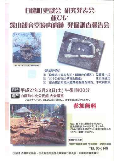 白鷹町史談会 研究発表会と国指定重要文化財である「深山観音堂」境内遺跡発掘調査が行われ、その報告会が開催されます。参加無料ですのでぜひおいでください。