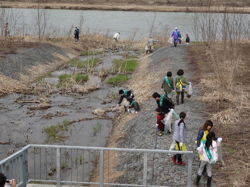 市役所の関係部署の皆さんと一緒に河川敷のゴミ拾いを実施しております。