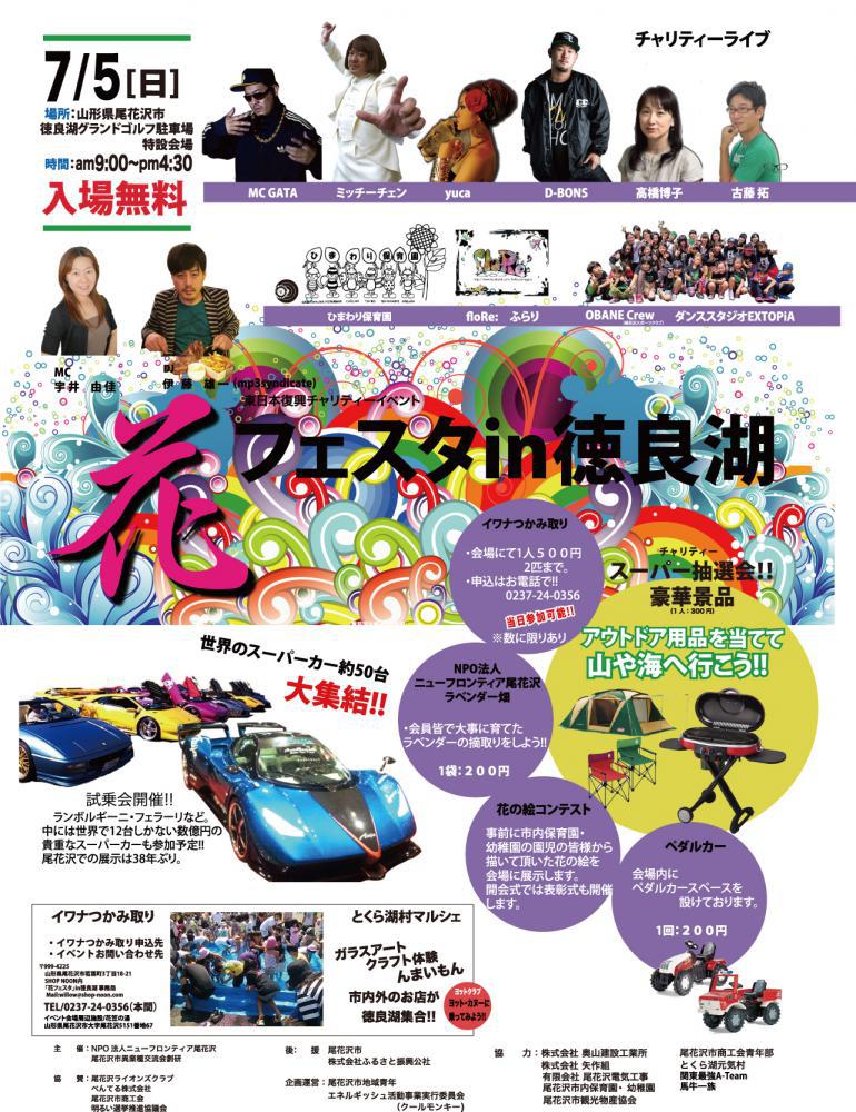 東日本復興チャリティーイベント「花フェスタIN徳良湖」 日時:7月5日(日) 9:00〜 16:00場所:徳良湖グラウンドゴルフ駐車場 特設会場 チャリティーライブ MCGATA・ミッチーチェン・yuca・D-BONS・高橋博子・古藤拓 ダンスパフォーマンス 世界のスーパーカー大集結 試乗会開催 いわなのつかみ取り(500円) チャリティースーパー抽選会!! 豪華景品が当たります 親子で楽しめるコーナー・マルシェ も開催