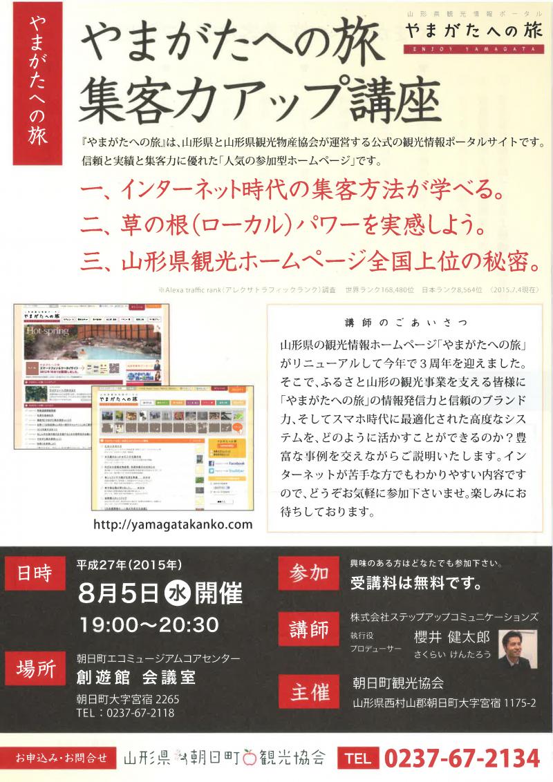 【終了しました】『やまがたへの旅』は山形県と山形県観光物産協会が運営する公式の観光情報ポータルサイトで、信頼と実績と集客力に優れた人気の「参加型ホームページ」です。このサイトの運営委託業者 株式会社ステップアップコミュニケーションズは、4月にリニューアルした当協会HPの制作・管理業者でもあり『やまがたへの旅』への参加により、当協会HP「コミュニティ」にも簡単にご参加いただけます。(協会員限定) そこで、まずは、同社執行役プロデューサー櫻井氏を講師に、集客力アップ講座を開催します。インターネットが苦手な方でもわかりやすい内容ですので、どうぞ、お気軽にご参加ください。お待ちいたしております。 日時:平成27年8月5日(水) 19:00〜20:30場所:創遊館 会議室参加料:無料主催:朝日町観光協会お申込み:電話 0237-67-2134 FAX 0237-67-2151 ホームページ(お問合せフォームよりお申込み下さい) → http://asahimachi-kanko.jp/contact/チラシ(申込書)のダウンロードはコチラ <関連リンク> 株式会社ステップアップコミュニケーションズ ホームページ