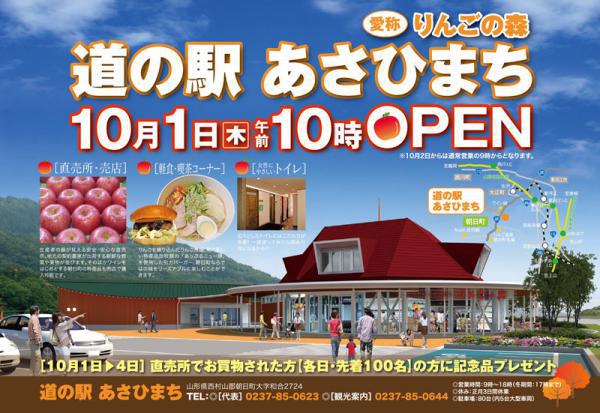 この度、朝日町に、新しい道の駅が誕生します。道の駅あさひまち 愛称「りんごの森」平成27年10月1日(木) 午前10時OPEN!※10月2日からは通常営業の午前9時からとなります。オープンを記念して10月1日(木)〜10月4日(日)直売所でお買物された方【各日・先着100名様】に記念品プレゼント。みなさまのお越しをお待ちしております。※駐車場80台 (内5台大型車両) チラシのダウンロードはコチラ 【道の駅あさひまち】山形県西村山郡朝日町大字和合2724TEL:0237-85-0623(代表)◎営業時間:9時〜18時(冬期間:17時まで)◎ 休 み :正月3日間休業