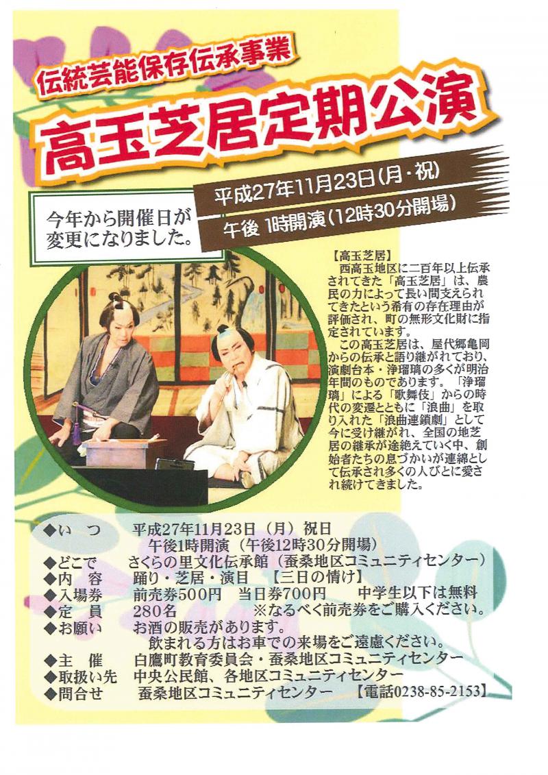 白鷹町の無形文化財「高玉芝居」が11月23日(月・祝)に開催されます!今年から開催日が変更になりました。今年は雪のない時期の開催となりますので、是非、皆様足を運んでください!