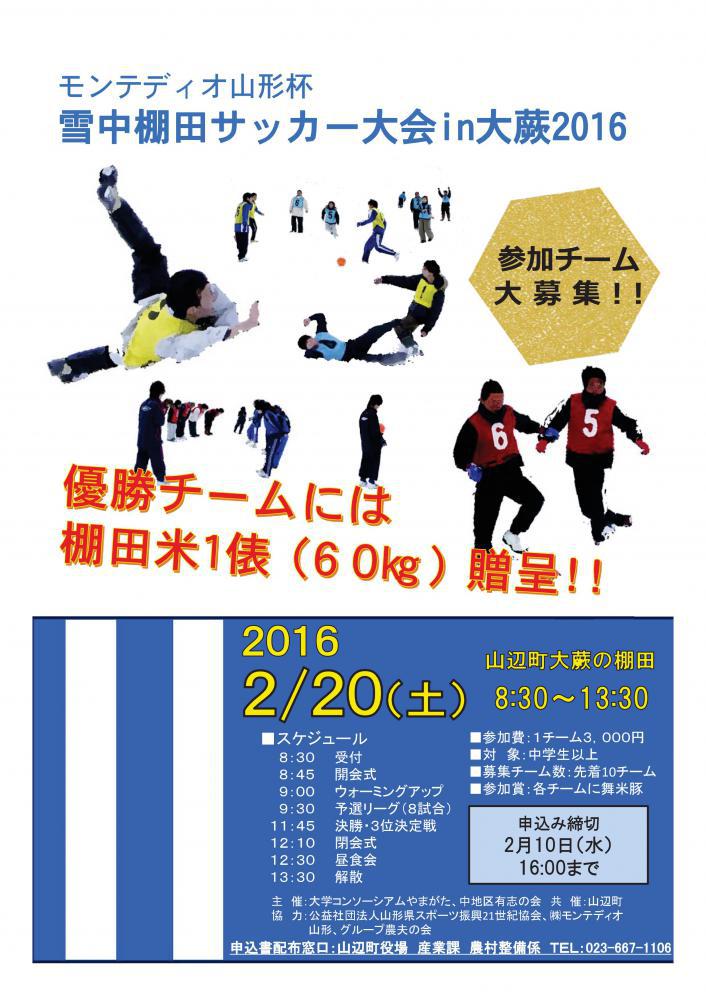 日本棚田百選に選定された「大蕨の棚田」で今年も『モンテディオ山形杯雪中棚田サッカー大会』を開催します。一面銀世界になった「大蕨の棚田」で白熱した雪中サッカーが繰り広げられ、モンテディオ山形のチームとサポーター、サッカーファン、ホームタウン住民との交流も楽しむ事ができます。優勝したチームには棚田米1表(60kg)が贈呈されます!「棚田での雪中サッカー」を楽しみながら、モンテディオ山形を盛り上げていきましょう!!また、参加チームも募集しています。 ◇開催日 2016年2月20日(土) ◇時 間 8:30〜13:30 ◇場 所 山辺町大蕨の棚田(山辺町役場中支所付近) 参加チームの募集 ◇参加費 1チーム 3000円(昼食時にわらび汁を提供します) ◇対象 中学生以上 ◇募集チーム数 先着10チーム ◇申込締切り 2月10日(水) 16:00まで ◇申込先 山辺町産業課(FAX:023−667−1108 / E-mail:sakai@town.yamanobe.yamagata.jp ) ◇お問合せ先 大学コンソーシアムやまがた(TEL023−628−4842)又は、山辺町産業課(TEL023−667−1106)