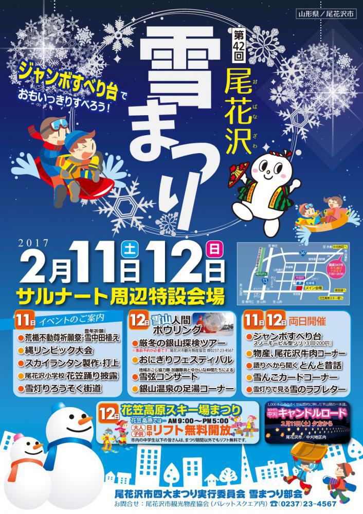 尾花沢雪祭り開催 豊富な雪でいっぱい遊びましょう〜 平成29年2月11日(土)・12日(日) 文化体育サルナート特設会場・花笠高原スキー場・道の駅ねまる等