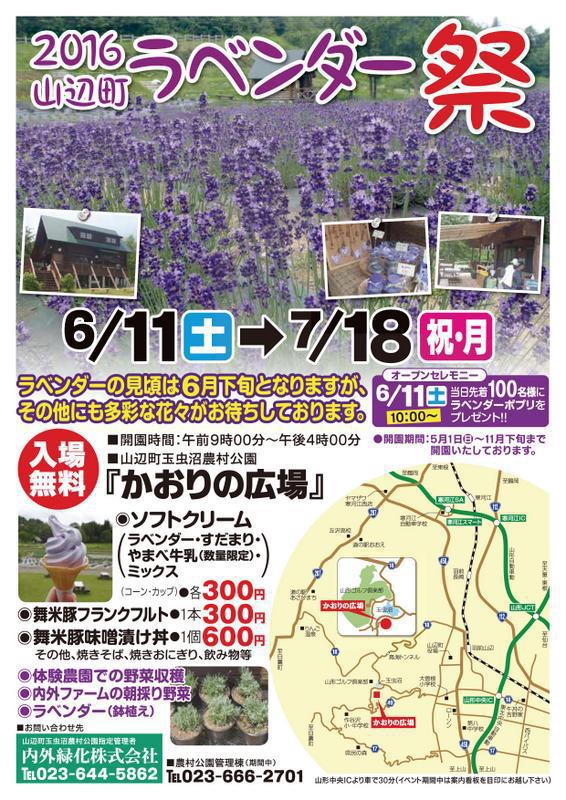 まもなく、山辺町にラベンダーの季節が近づいてきました(*^_^*)今年の冬は雪が少なく、暖かい日が続いたおかげで『かおりの広場』のラベンダーはぐんぐん大きくなっています。今年の『ラベンダー祭』は例年より1週間早い6月11日(土)からの開催となりました。 お祭り開催中は、大人気のラベンダーソフトクリームのほか、今年は新たに山辺町でしか味わえない「すだまり」と「やまべ牛乳」味が登場します〜(^^♪ その他、山辺町の特産品「舞米豚」を使ったメニューやフランクフルト等もお楽しみいただけます。また、体験農園での野菜収穫やラベンダーの鉢植え等の販売もあります。 なお、今年はラベンダー祭期間中に、町の特産品が当たる “ラベンダー祭スタンプラリー” を開催します。 2016ラベンダー祭□開催期間 6月11日(土)〜7月18日(祝・月)□開催場所 山辺町玉虫沼農村公園 『かおりの広場』□開園時間 午前9時〜午後4時□お問合せ先 内外緑化株式会社 [TEL] 023−644−5862※なお、6月11日(土)は、オープニングセレモニーとして、10:00より先着100名様にラベンダーポプリをプレゼントいたします!! 皆さまのたくさんのお越しをお待ちしております♪