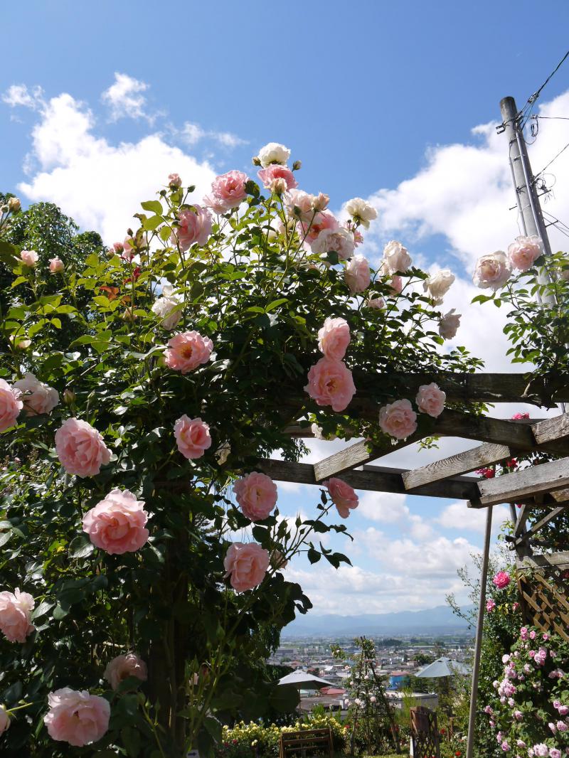 青空のもと、バラの香りに包まれた園内は、多くのお客様で賑わっています。