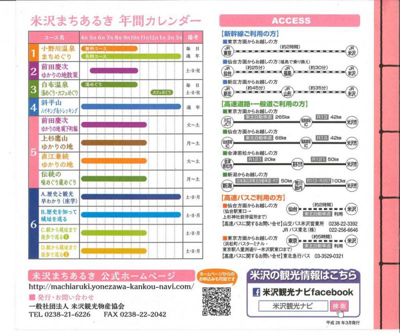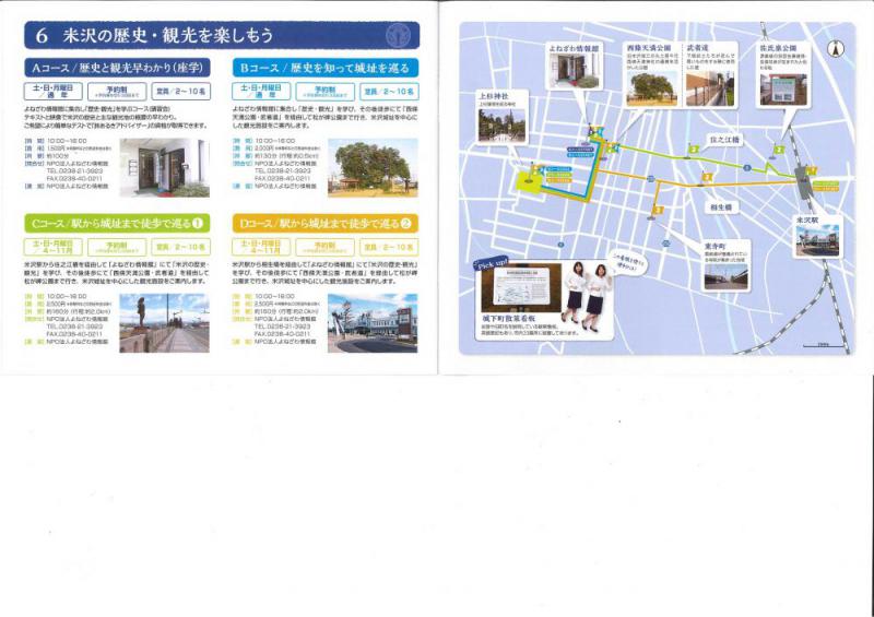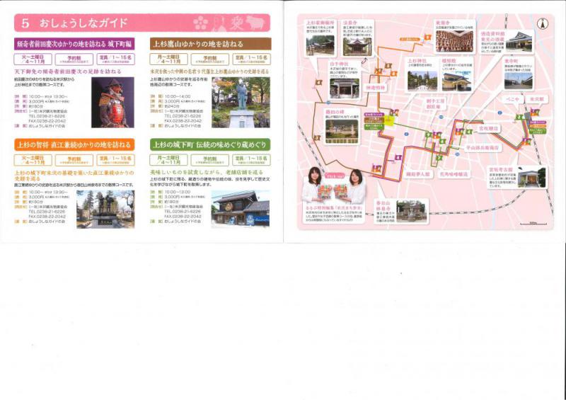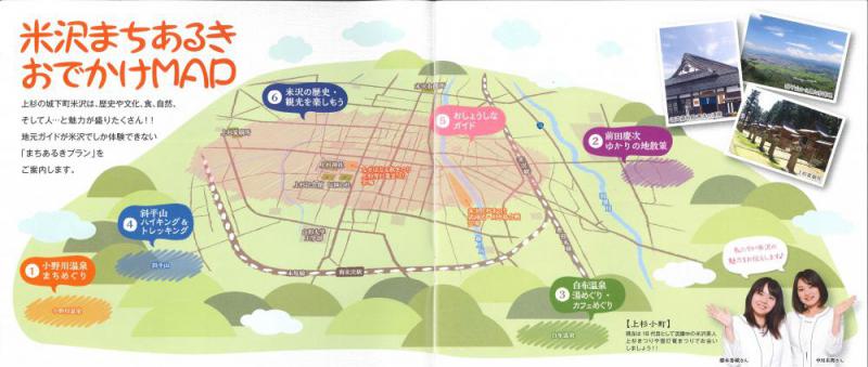 米沢の市内をガイドと一緒にまちあるき!市内のまちあるきボランティアガイド団体の情報を集約したまち歩きガイドブックとホームページが完成いたしました。ホームページリンクアドレスhttp://machiaruki.yonezawa-kankou-navi.com/ホームページからご予約可能でございますので、ぜひお申し込みください。1.小野川温泉まちめぐり2.前田慶次ゆかりの地散策3.白布温泉湯めぐり・カフェめぐり4.斜平山(なでら山)ハイキング&トレッキング5.おしょうしなガイドと行く米沢市内まち歩き歴史観光6.米沢の歴史観光を楽しもう 座学 学びの観光今までは情報発信できていなかった魅力あるまち歩きの具体的なコースまち歩き、里山歩きの旅行商品となります。米沢に宿泊されるお客様の観光コ-ースとして旅行の目的としてぜひご利用いただきますようよろしくお願いします。