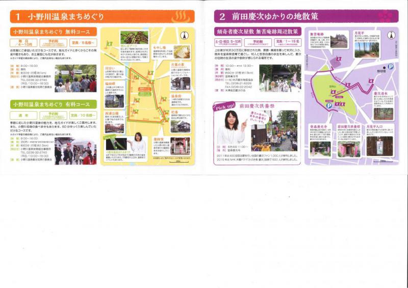 1.小野川温泉まちめぐり 2.前田慶次ゆかりの地散策