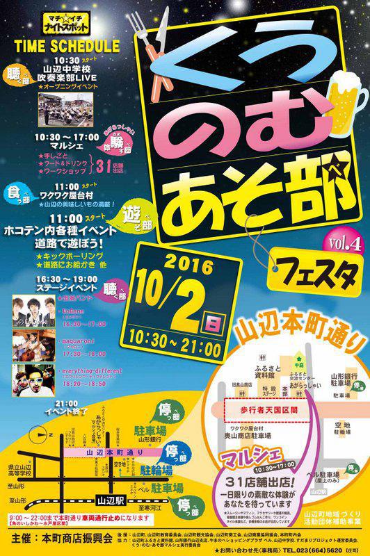 10月2日(日)に、山辺町の本町通りにて「くう・のむ・あそ部(べ)フェスタ」を開催します(^o^)/当日は、山辺本町通りを歩行者天国にして、聴く部(きくべ)、体験す部(ためすべ)、食う部(くうべ)、遊そ部(あそべ)をテーマに、多彩なイベントが繰りひろげられます。また、ふるさと交流センター“あがらっしゃい”を会場にマルシェも開催します♪マルシェには、おいしいフード&ドリンクのお店のほか、ワークショップやハンドメイドのオリジナル雑貨品などが並びます。 10月2日(日)は、山辺町で、食べて!飲んで!遊んで!楽しい時間を過ごしましょう!(^^)! 「くう・のむ・あそ部フェスタ」vol.4□日 時 2016年10月2日(日)□時 間 10:30〜21:00□場 所 山辺本町通り □スケジュール 10:30〜 オープニングイベント(山辺中学校吹奏楽部演奏) 10:30〜17:00 マルシェ 11:00〜 ワクワク屋台村 ホコテン内各種イベント 16:30〜19:00 ステージイベント 21:00 イベント終了 □主 催 本町商店振興会 □お問合せ先 事務局[TEL] 023−664−5620