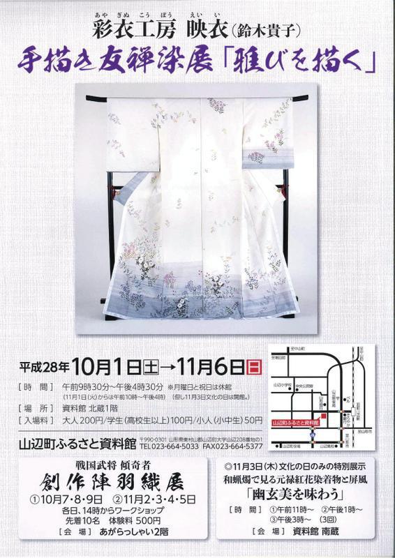 ただ今、ふるさと資料館では、彩衣工房 映衣(鈴木貴子)氏による『手描き友禅染め展』を開催しています。「春・夏・秋・冬」をそれぞれ表現した友禅染めや、かわいらしい小物等まで多数展示しています。手描きによる繊細で美しい友禅染めをぜひご覧ください。 彩衣工房 映衣(鈴木貴子) 手描き友禅染展「雅びを描く」 □日 時 平成28年10月1日(土)〜11月6日(日)□時 間 午前9時30分〜午後4時30分 (11月1日(火)からは午前10時〜午後4時) ※月曜日と祝日は休館(但し11月3日文化の日は開館)□場 所 資料館北蔵1階□入場料 大人200円・学生(高校生以上)100円・小人(小中生)50円□お問合せ先 山辺町ふるさと資料館 [TEL]023−664−5033
