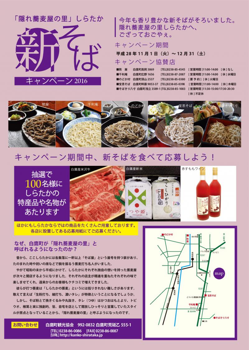 新そばを食べて応募すると抽選で100名様にしらたかの特産品や名物が当たります。
