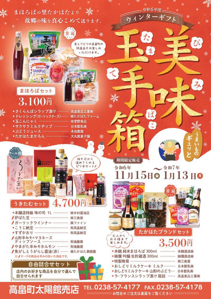 ↑お申込み用紙はこちらから 令和6年度 ウィンターギフト うまいものギュッと 『美味玉手箱』「期間限定販売!」 令和6年11月15日(金)〜令和6年1月13日(月)お歳暮・お年始に高畠の美味しいものがギュッと詰まったギフトはいかがですか。遠く離れた大切な方へ、いつもお世話になっている方へ、自分へのご褒美に…まほろばの里たかはたより、故郷の味を真心こめて送ります!今年の一押しは、寒い冬に体を芯から温めてくれるピリ辛の商品を揃えた「うきたむセット」どのセットも高畠町の企業の商品を詰め合わせたココ「太陽館売店」でしか買えないギフトですので、ぜひお買い求めください♪お問い合わせ、ご注文は≫≫高畠町太陽館売店 TEL:0238‐57‐4177/FAX:0238‐57‐4178 お問合せフォームはこちらから道の駅たかはた(観光案内所) TEL:0238‐52‐5433/FAX:0238‐52‐5055
