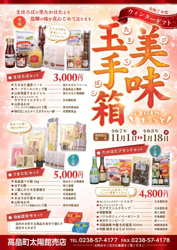 ↑お申込み用紙はこちらから 令和7年度 ウィンターギフト うまいものギュッと 『美味玉手箱』「期間限定販売!」 令和7年11月1日(土)〜令和8年1月18日(日)お歳暮・お年始に高畠の美味しいものがギュッと詰まったギフトはいかがですか。遠く離れた大切な方へ、いつもお世話になっている方へ、自分へのご褒美に…まほろばの里たかはたより、故郷の味を真心こめて送ります!どのセットも高畠町の企業の商品を詰め合わせたココ「太陽館売店」でしか買えないギフトですので、ぜひお買い求めください♪お問い合わせ、ご注文は≫≫高畠町太陽館売店 TEL:0238‐57‐4177/FAX:0238‐57‐4178 お問合せフォームはこちらから道の駅たかはた(観光案内所) TEL:0238‐52‐5433/FAX:0238‐52‐5055