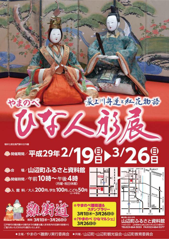 江戸時代の豪商が京より取り寄せたとされる歴史的にも貴重な雛人形を、山辺町ふるさと資料館と町内中心商店街店舗で公開します。ふるさと資料館では、最上川舟運により運ばれてきた貴重な雛人形を小道具一つ、一つにもこだわり、村山地方らしい飾りで展示します。また、「やまのべ雛街道」として町内中心商店街の各店舗内にて、江戸時代の寛永雛から現代までの貴重な雛人形を無料でご覧いただけます。展示期間中は、やまのべ雛街道スタンプラリーや雛コンサート、折り雛教室など多彩なイベントを開催します♪皆様のお越しをお待ちしています(^o^) 【やまのべ雛人形展】 ◇開催期間 2月19日(日)〜3月26日(日) ◇開催会場 山辺町ふるさと資料館 ◇開催時間 午前10時〜午後4時 ◇入館料 大人200円、学生100円、小人50円 (月曜日が休館日) ◇お問い合わせ先 山辺町ふるさと資料館 http://www.town.yamanobe.yamagata.jp/soshiki/14/shiryoukan.html TEL023−664−5033 【やまのべ雛街道】 ◇展示期間 3月1日(火)〜3月26日(日) ◇開催会場 町内ひな雛人形展示協力店 ◇開催時間 各店舗営業時間内 ◇料 金 無料 [期間中のイベントスケジュール] 開催日時 内容 その他 2月24(金)〜3月5日(日) 午前10時〜午後4時 佐藤康夫『切り絵展』 ※3月5日(日)ワークショップ開催あり 3月4日(土) 午後3時〜4時 雛コンサート 3月5日(日) クリスマスローズ展示即売会 3月7日(火)〜3月12日(日) 午前10時〜午後4時 斎藤ちや『ちぎり絵展』 ※3月12日(日)ちぎり絵体験サロン 3月11日(土)、3月25日(土) 午後2時〜3時 昔語り会 3月14日(火)〜19日(日) 午前10時〜午後4時 やまのべ物づくり展 石工芸、陶器、絹織物など 3月24日(金)〜26日(日) 午前10時〜午後4時 山辺ニット展示販売会 ニット館すだまり 3月26日(日) 午前10時〜午後4時 やまのべ雛マルシェ ハンドメイド作品販売・ワークショップなど 山形県村山地域でお雛様を展示している12施設を1,700円でお得に見学できる。『やまがた雛三昧パスポート』は絶賛発売中です!詳しくはこちらからどうぞ。