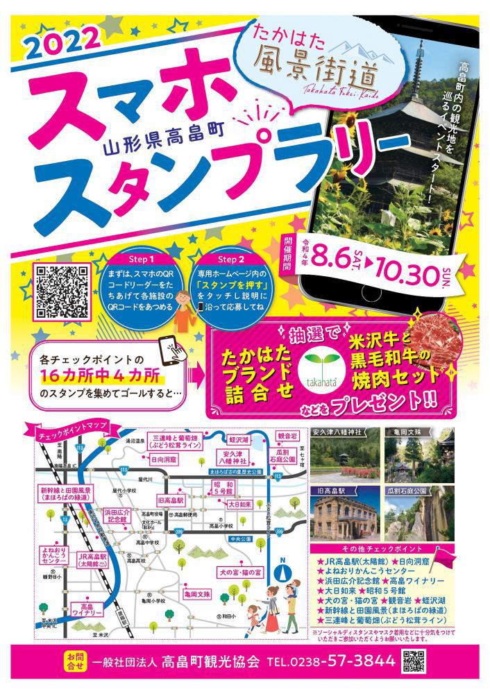 今年も、高畠町の名所を巡るスマホスタンプラリーを開催します!町内16カ所のスポットにあるQRコードを4カ所集めて賞品をゲットしよう!★QRコード設置場所@JR高畠駅(高畠町太陽館)…施設内の観光案内所 設置場所はこちらA安久津八幡神社…延年の館の扉 設置場所はこちらB瓜割石庭公園…入り口の由来看板の隣 設置場所はこちらC犬の宮・猫の宮…犬の宮階段横の由来の看板の隣 設置場所はこちらD旧高畠駅…駅舎向かって左隣 設置場所はこちらE浜田広介記念館…入り口自動ドア手前 設置場所はこちらF亀岡文殊…伊藤商店の隣 設置場所はこちらG日向洞窟…説明看板の隣 設置場所はこちらH高畠ワイナリー…受付カウンター 設置場所はこちらIよねおりかんこうセンター…中庭黒牛像の近く 設置場所はこちらJ昭和5号館…玄関向かって右手 設置場所はこちら K大日如来…説明看板の隣 設置場所はこちらL観音岩…駐車場看板の隣 設置場所はこちらM蛭沢湖…売店駐車場付近 設置場所はこちらN新幹線と田園風景…まほろばの緑道 設置場所はこちらO三連峰と葡萄畑…ぶどう松茸ライン 設置場所はこちら皆様のご参加、お待ちしております(^^♪