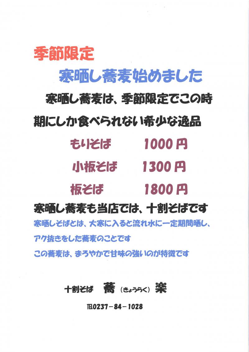 ▼<手打ち十割そば 蕎楽>寒晒し蕎麦始まりました。