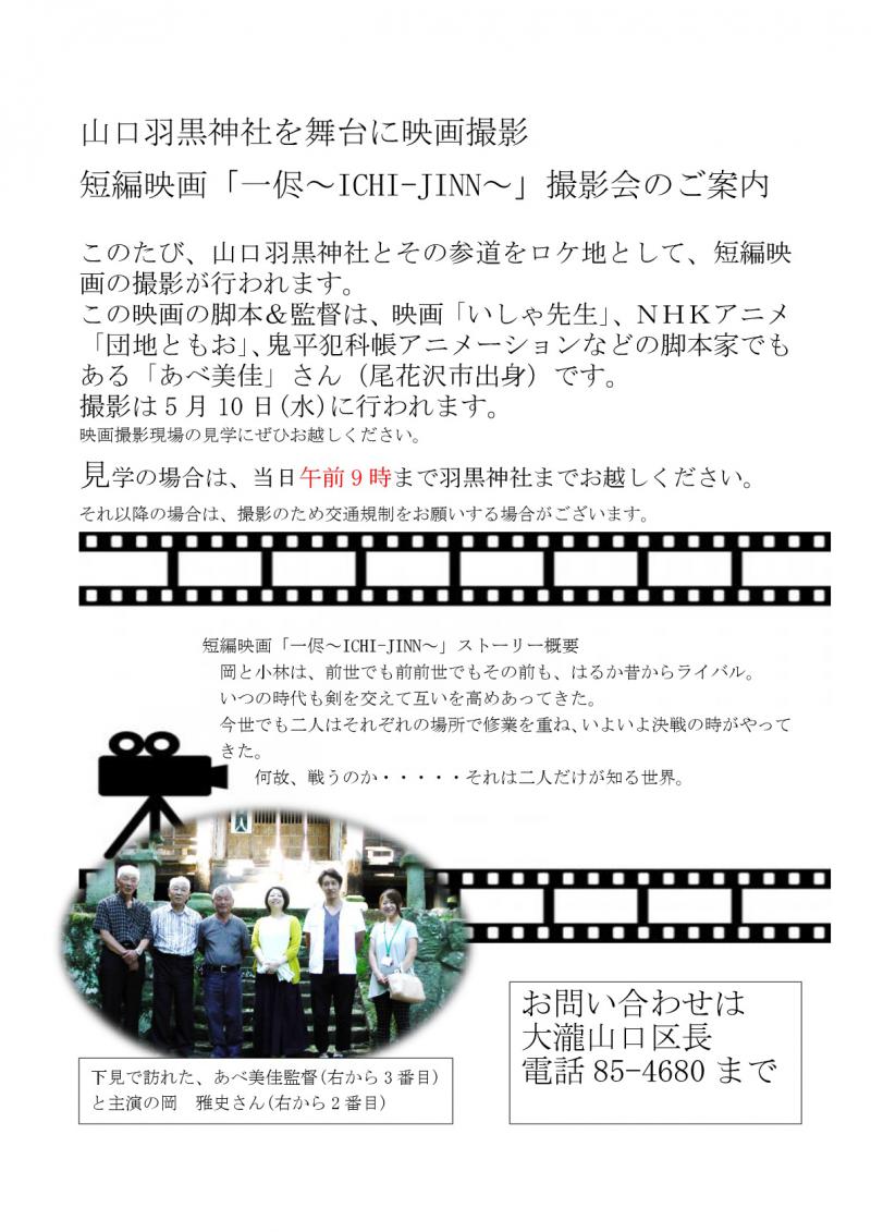 映画撮影現場の見学をされる方は当日午前9時までに羽黒神社までお越しください。