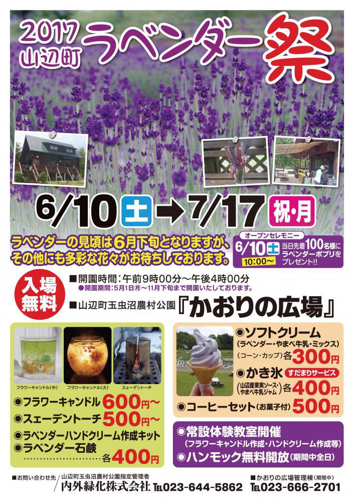 いよいよ今年も山辺町『かおりの広場』にて“ラベンダー祭”がはじまります♪天気のいい日が続いています。青空の下で『かおりの広場』のラベンダーはぐんぐん成長しています。今年も紫色の香り豊かなラベンダーの花々が皆様のお越しをお待ちしています(*^_^*) 祭期間中は、毎年大人気のラベンダーソフトや、今年が新発売となる山辺産果実ソースを使ったかき氷も販売します。もちろん山辺町でしか味わえない“すだまり氷”もあります♪♪また、今年はフラワーキャンドルやハンドクリーム作成等の体験教室も開催します。 6月10日(土)はオープニングセレモニーがあります。当日は先着100名様にラベンダーポプリをプレゼント!!たくさんの皆様のお越しをお待ちしています〜(^^♪ 2017山辺町『ラベンダー祭』□開催期間 2017年6月10日(土)〜7月17日(祝・月)□開催場所 山辺町玉虫沼農村公園『かおりの広場』□開催時間 午前9時〜午後4時□お問合せ先 内外緑化株式会社 【TEL】023−644−5862