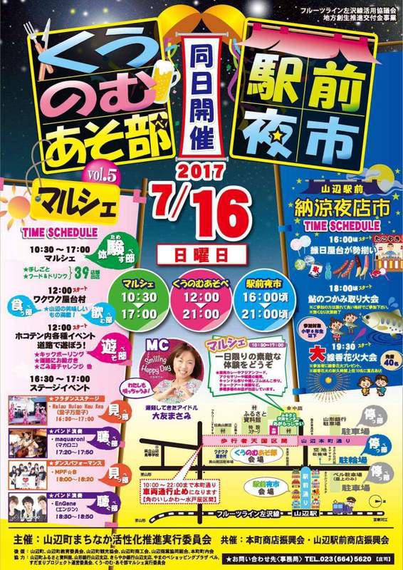 7月16日(日)に山辺町本町通り・駅前通りにて『くう・のむ・あそ部』マルシェと『駅前夜市』を同日開催します。当日は本町通りが歩行者天国になり、マルシェの開催や屋台村、ステージイベント等が繰りひろげられます。体験す部(ためすべ)、食う部(べ)、のむ部(べ)、あそ部(べ)をテーマに一日中楽しむ事ができます(^^♪ご家族で、ご友人で、み〜んなで遊びに来てくださいね♪ 「くう・のむ・あそ部」「駅前夜市」□日 時 2017年7月16日(日)□時 間 10:30〜21:00頃□場 所 山辺本町通り・駅前通り □スケジュール マルシェ 10:30〜17:00 くうのむあそべ 12:00〜21:00 駅前夜市 16:00〜21:00□主 催 山辺町まちなか活性化推進実行委員会□お問合せ先 事務局[TEL] 023−664−5620