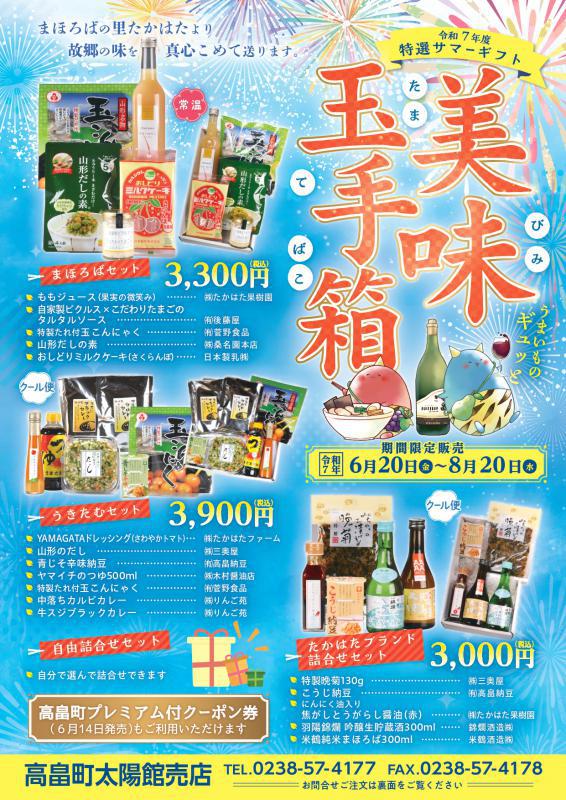 ↑申込書はこちら【うまいものギュッと】令和7年度 高畠町特選サマーギフト『美味玉手箱』令和7年6月20日〜令和7年8月20日までの「期間限定販売!」まほろばの里 たかはた より、真心込めて故郷の味を!大切な友人、知人、親族の方へ高畠町の特産品をギュッと詰め込んだ夏のギフトはいかがでしょうか♪高畠町プレミアム付きクーポン券もご利用いただけます!<<プレミアム付きクーポン券詳細はこちらをクリック!>>お問い合わせ、ご注文は≫≫高畠町太陽館売店 0238−57−4177