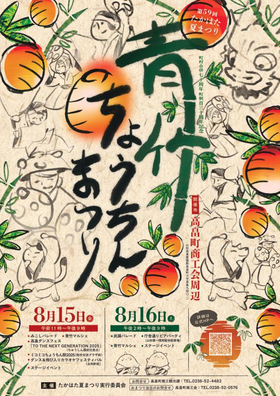 300年以上の歴史を持つこの祭りは、安久津八幡神社の御神輿が、年に一度の縁日に高畠巌島神社に一夜泊まる際に、道沿いの家々が青竹にちょうちんを灯して御神輿を迎えたことが始まりと言われています。現在では、高畠地区商店街で各戸が1〜2本の青竹ちょうちんを飾り、その中を夕方から夜にかけて、15日は神輿パレード、16日は民謡パレードを行います。共催イベントも盛りだくさんです!高畠の熱い夏をお楽しみください(青竹ちょうちんまつり 由来はこちら)<開催日>令和7年8月15日(金曜日) 午前11時から午後9時まで令和7年8月16日(土曜日) 午後 2時から午後9時まで JR高畠駅と会場をつなぐ無料のシャトルバスが両日ともに運行します。駅から15分で会場までお送りいたしますので、ぜひご活用ください。 ※時刻表は、随時更新させていただきます。※時刻表の時間はあくまで予定です。交通状況等により、遅延する場合がございます。※満席の際には、ご乗車できない場合がございますので、ご了承ください。※この時間以外に、駅または会場に向かう際には、タクシーをご利用ください。 高畠町多目的広場高畠町中央公園 駐車場JA山形おきたま たかはた支店 駐車場高畠町文化ホール・まほら 駐車場▼詳細は以下のQRコード、もしくはURLからもご確認いただけます。https://www.google.com/maps/d/viewer?mid=1DHQKDEuvvvVNL-vktK6nOsSgyMAJdDo&usp=sharing 15日イベント〇みこしパレード 【場所】高畠町商工会前スタート・ゴール【時間】祈願祭 18:15〜 予定 スタート 18:30〜 予定【参加団体】 高畠町商工会青年部(三重塔みこし) 高畠町建設組合青年部(六方みこし) 華神輿組(華神輿) 高畠町役場(龍みこし) 〇高畠ダンスフェス「TO THE NEXT GENERATION 2025」【場所】ちゅうしん蔵前交差点【時間】11:00〜16:40 [1stステージ] 11:00〜14:00 [DJ出演] 14:00〜14:30 [2ndステージ] 14:30〜16:40【出演グループ】 The Groovy 75 ドラゴンティアーズ絆 X1 BEAT FACTORY EVE Fam ties オニッコ ジャンヌダルク【出演DJ】 Mountain Killa高畠町のグループを中心とした山形県の多彩なダンスグループが、ジャンルや世代を超えて大集合!迫力のステージ、心に響く表現、思わず体が動き出すようなリズムの数々。ダンスが好きな方はもちろん、「あまり見たことがない」という方も、きっと心が動くはず。この日限りの感動を、青竹ちょうちん祭りで一緒に体感しませんか?世代を越えて受け継がれるダンスの魅力。子どもから大人まで、未来へ羽ばたくエネルギーあふれる高畠ダンスフェスをお楽しみください。※出演グループ・タイムスケジュールは、随時更新させていただきます。〇ダンス&飛び入りカラオケフェスティバル【場所】永和軒前【時間】18:00〜21:00【パフォーマー】The Groovy 75 Mountain Killa (DJ) 司会:加藤マチャアキ 歌とダンスで青竹ちょうちんまつりを一緒に盛り上げましょう!〇ミコミコちょうちん祭2025【場所】高畠町総合交流プラザ周辺【日程】10:00〜16:00キッチンカーやミニ縁日など、お楽しみが目白押し!アニメグッズ中心のフリーマーケットの「ミコいち」や、県内外の痛車が集結する「痛車コーナー」で、アニメが好きな人にはもってこいのイベントです。高畠町総合交流プラザ内の多目的スペースでは タカラトミー公式ベイブレード大会を開催します!【大会名】S1:羽前杯プチinミコちょうコラボカップ (全対戦 3ON3バトルのトーナメント)【定 員】24名 ※TwiPlaからのエントリー ※当日受付あり【持ち物】ベイブレード(最低3組)、ランチャー、3ON3デッキケース▼詳細は以下のQRコード、もしくはURLからご確認いただけます https://sites.google.com/view/oremaka-takahata/host_event/mikocho 主催:おれまか〇ゆるキャラ登場【場所】商工会本部周辺【時間】17:00〜18:30(神事に合わせて)高畠町公式キャラクター「たかっき・はたっき」と、山形県のマスコットキャラクター「きてけろくん」が登場!16日イベント〇民謡パレード【場所】 スタート 幼児の部…おばこや前 一般の部…厳島神社前 ゴール 幼児の部、一般の部前半…高畠町総合交流プラザ前 一般の部後半…永和軒前 【日程】17:30 幼児の部から順次スタート予定高畠花笠音頭を美しく、可愛らしく、元気よく各団体ごとの個性ある踊りをお楽しみください。 〇庁舎通りビアパーティー【場所】山形第一信用組合南側駐車場 庁舎通り商店街が主催する「ビアパーティー」 ビールやグルメの販売があり、まつりとお酒を楽しめます!両日開催イベント〇青竹マルシェ 【場所・日時】15日(11:00〜21:00) まほろば通り(高畠町総合交流プラザ前) 16日(14:00〜21:00) 商工会前駐車場 町内外からたくさんのハンドメイド雑貨・アクセサリーやキッチンカーが出店いたします。ぜひ足をお運びください!〇ステージイベント〈15日〉【場所】商工会前駐車場 【時間】14:50〜21:00(みこしパレード中は休止)〈16日〉【場所】山形銀行高畠支店 駐車場 【時間】14:00〜17:00 バンド演奏やダンスの披露など日中から楽しめるステージイベントを開催! 主催:自由小屋、ワクワク協議会〇青竹イ