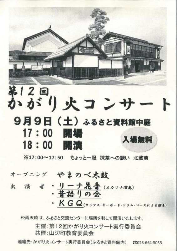 ふるさと資料館にて、「かがり火コンサート」を開催します。今年で12回目となる「かがり火コンサート」では、オカリナ演奏や昔語り会等が行われます。秋の夜長にかがり火の灯りの下で、幻想的な時間を過ごしてみませんか! 第12回かがり火コンサート□日 時 平成29年9月9日(土)□場 所 ふるさと資料館中庭□時 間 17:00開場 18:00開演 ※17:00〜17:50 ちょっと一服抹茶への誘い□入 場 無料□お問合せ先 かがり火コンサート実行委員会 (ふるさと資料館) TEL:023−664−5033
