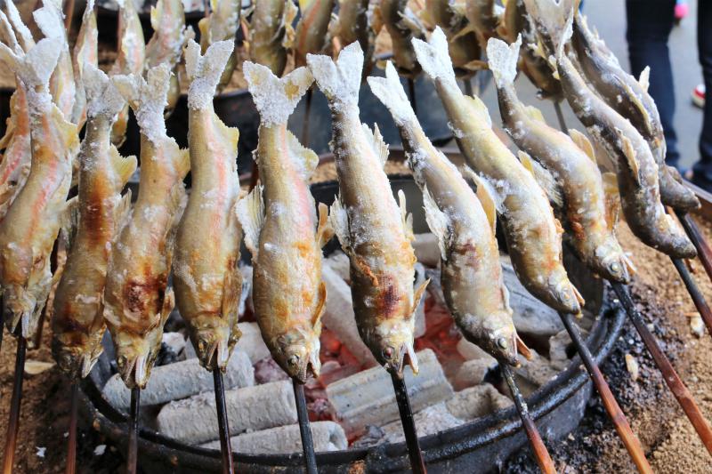 名物、鮎の塩焼きをはじめ、豆腐田楽、米沢牛の串焼き、芋煮や玉こんにゃくなど