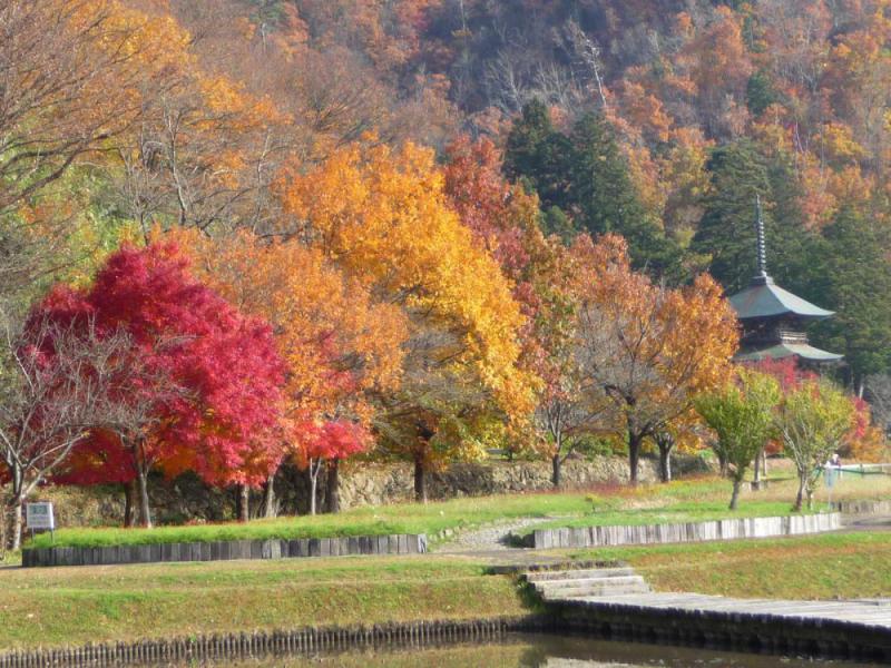 歴史公園と三重塔周辺は、葉の色合いがいっそう鮮やかになり、見事な風景が見られます。まだまだ見頃です。