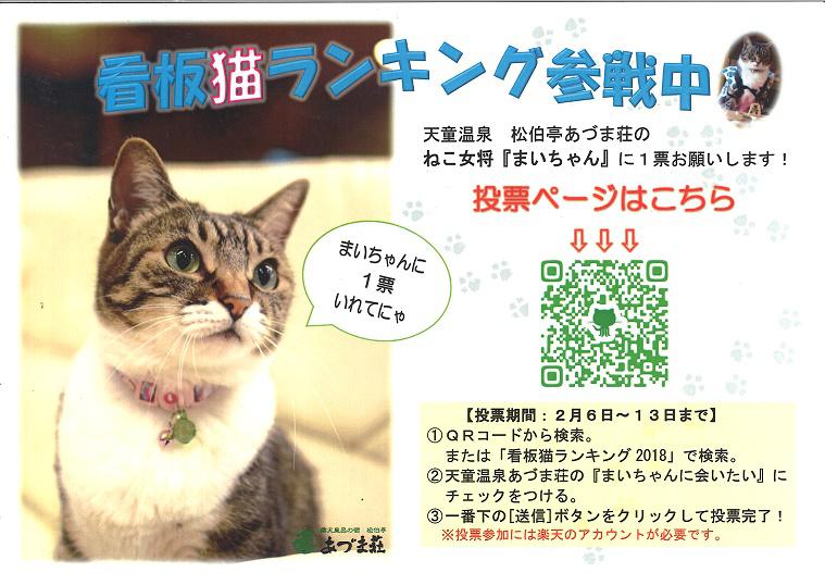 天童温泉 松伯亭あづま荘のねこ女将『まいちゃん』がランキングの結果、