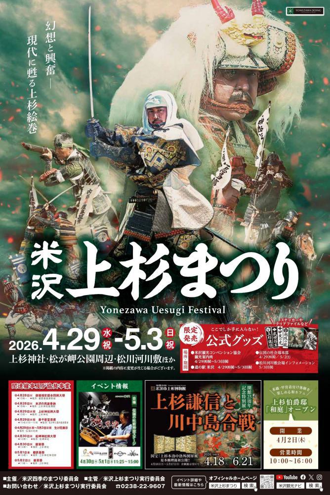 米沢上杉まつり令和8年4月29日(水)〜5月3日(日)開催!幻想と興奮現代に甦る上杉絵巻2026年 イベントスケジュール 4/29(水) 開幕祭/伝国の杜周辺 8:30〜 オープニングセレモニー 9:00〜 ステージイベント 10:00〜 上杉神社例大祭 11:15〜 民踊流し(伝統の新花笠音頭・花笠音頭の交互パレード) 12:40〜17:30 ステージイベント まつりの開幕を飾る祭典(ステージイベント・民踊流し) ★謙信公の命日であるこの日、800名もの踊り手らが色とりどりの 衣装に身を包み、様々な踊りを奉納します。 4/30(木) 10:00〜 松岬神社例大祭 松岬神社の祭神には、上杉鷹山・上杉景勝と景勝の重臣直江兼続、鷹山の師細井平洲、鷹山を補佐した竹俣當綱・莅戸善政が配祀されています。 4.30(木)・5.1(金) 武将隊と上杉太鼓 魂の響演 やまがた愛の武将隊と上杉太鼓民謡一家によるステージイベント 5/2(土) 16:15〜 武?式軍団行列 【上杉家廟所→上杉神社】 16:30〜 奉納古武道ステージ/伝国の杜前広場特設ステージ 17:30〜 やまがた愛の武将隊ステージ/伝国の杜前広場特設ステージ 18:30〜 武?式/伝国の杜前広場 戦勝祈願、上杉謙信出陣の儀式です。 ★謙信公は生涯において、自ら先陣に立って戦っていました。 その出陣の度に武てい式と称する儀式を行い、 神仏に戦勝を祈りました。その武てい式をここで再現し、 詰めかけた観客をしばし戦国の世へ誘います。 5/3(日) 9:30〜 みこし渡御/スタート場所未定 上杉神社おみこし・市内小学校鼓笛隊が練り歩きます。 10:20〜 上杉軍団行列/興譲小学校前スタート 川中島へいざ出陣!武者行列が威風堂々と市内を練り歩きます。 14:00〜 川中島合戦/松川河川敷 上杉・武田の激突!戦国史上最大の死闘を再現します。 関連催事及び協賛事業4月28日(火) 御堀端史跡合同例大祭 10:00〜 餐霞館趾前 夕方 米沢の民謡奉納4月29日(水) 上杉神社例大祭 米沢の四季の太鼓 4月30日(木) 松岬神社例大祭 献華祭 10:00〜 上杉神社 5月1日(金) 鯉供養祭 14:00〜 上杉神社神池前 5月2日(土) 献茶祭 11:00〜 上杉神社4月29日(水)〜5月3日(日)生け花展示 伝国の杜前詳しくはホームページをご覧ください。こちらhttps://uesugi.yonezawa-matsuri.jp/川中島合戦桟敷席受付開始4月1日 午前9時〜川中島合戦 一席3,000円(お土産付き)インターネット「楽天チケット」のみでの受付となります。お問い合せ:米沢上杉まつり実行委員会TEL.0238-22-9607[ホームページアドレス] http://uesugi.yonezawa-matsuri.jp/