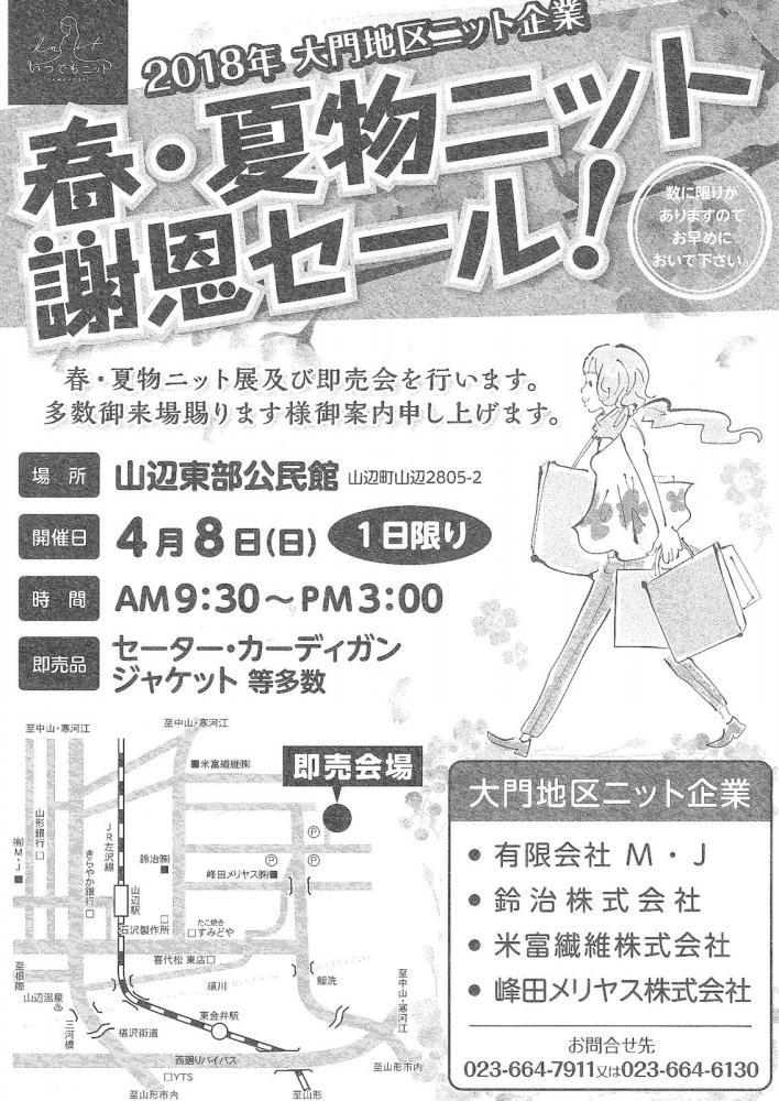 山辺町のニット製品は、首都圏の百貨店展等に納品されている高級ニットです。大門地区にあるニット企業4社による春・夏物ニット展及び即売会を行います。山辺の高級ニット製品が工場直売価格でお買い求めいただけます!!数に限りがありますのでお早目においで下さい。 春・夏物ニット謝恩セール!□場 所 山辺東部公民館 住所・・山辺町山辺2805-2□開催日 2018年4月8日(日)□時 間 AM9:30〜PM3:00□即売品 セーター・カーディガン・ジャケット等□お問合せ先 023−664−7911又は023−664−6130