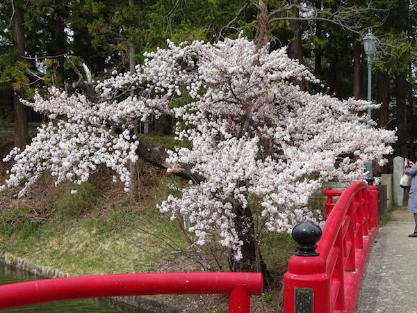 赤い太鼓橋「菱門橋」の横の桜は八分咲きです。欄干の高さですぐそばで桜の花が観られます。