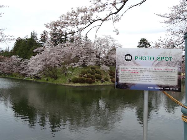 「撮影スポット」立て札とお堀で囲まれた旧米沢城本丸跡方面です。