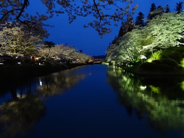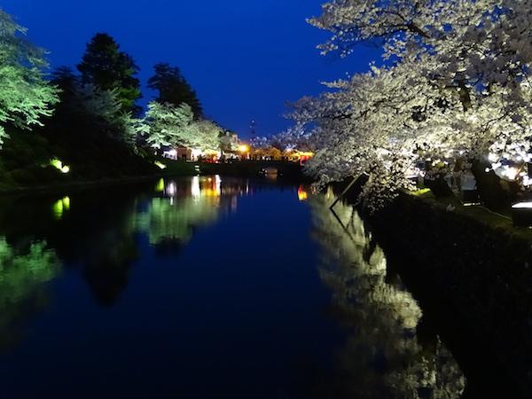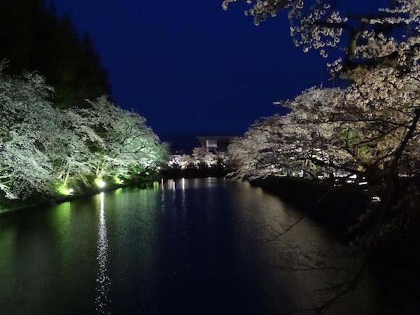 お堀の周りのライトアップされた夜桜を見物する人影