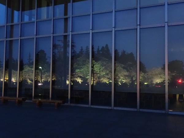 「伝国の杜」喫茶の硝子戸に写るライトアップされた夜桜です。