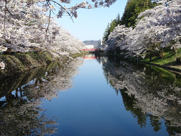 写真の撮影された場所は、上杉神社南側で『菱門橋と水面に映る満開の桜』が絶景と評されています。