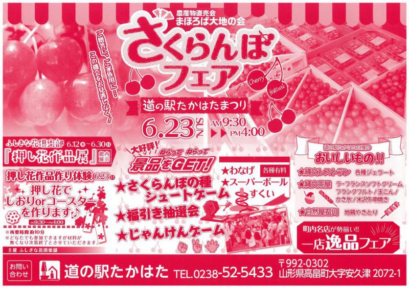 6月23日 (日) 9:30〜16:00道の駅たかはたまつり さくらんぼフェア 開催!!地元生産者のこだわりのさくらんぼはいかがですか?その他にも・さくらんぼの種シュートゲーム・福引き抽選会・じゃんけんゲームなどイベント盛りだくさんヾ(@^▽^@)ノ ご贈答に、ご家族用に… 山形のさくらんぼをご購入ならこの機会をお見逃しなく!