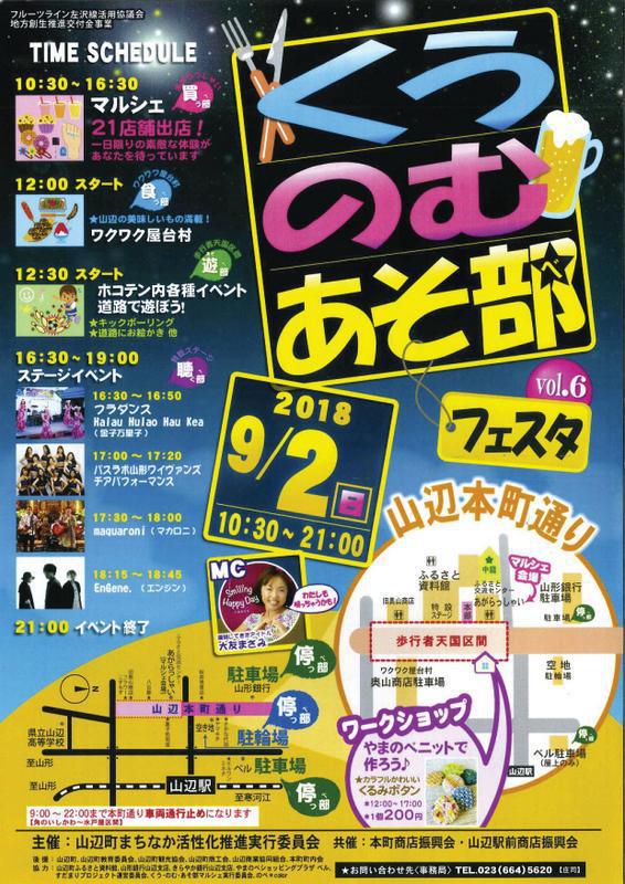 9月2日(日)、山辺本町通りにて、「くう・のむ・あそ部(ベ)フェスタ」を開催します。当日は、本町通りの一部が歩行者天国になり、普段あそべない道路で各種イベントが繰りひろげられおもいっきり遊ぶ事ができます(^^♪また、山辺町のおいしいもの満載の屋台村や、21店舗のマルシェがオープンし手作りの雑貨品やアクセサリー、ワークショップ等も開催します。9月2日は山辺町で食べて、飲んで、遊べる一日を過ごしてみませんか♪ 「くう・のむ・あそ部(べ)フェスタ」vol.6□日 時 2018年9月2日(日)□時 間 10:30〜21:00□場 所 山辺本町通り□スケジュール 10:30〜16:30 マルシェ 12:00〜 屋台村 12:30〜 歩行者天国 16:30〜19:00 ステージイベント 21:00 イベント終了□主 催 山辺町まちなか活性化推進実行委員会□お問合せ先 事務局 TEL:023−664−5620