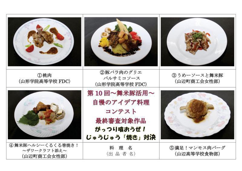 11月3日(文化の日)は「第10回やまのべ・まるごと・フェスティバル」開催されます。その中で行われる、山辺町の特産品舞米豚を使った「自慢のアイデア料理フェスタ」は毎年大人気のイベントの一つです。今年で10回目となる「自慢のアイデア料理フェスタ」に参加する最終5作品の料理が決定しました!!今年のテーマはがっつり食おうぜ!じゅうじゅう【焼き】対決多数応募いただいた中で、一次審査を通過した作品から、9月8日(土)に2次審査会(試食審査)が行われました。審査員により料理の「おいしさ」や「アイデアの斬新性」等が審査され、次の5作品に決定しました。 ◇料理名と【出品者】・桃肉 【山形学院高等学校フードデザインクラブ】・豚バラ肉のグリエ バルサミコソース 【山形学院高等学校フードデザインクラブ】・うめーソースと舞米豚 【山辺町商工会女性部】・舞米豚ヘルシーくるくる巻焼き! 〜ザワークラフト添え〜 【山辺町商工会女性部】 ・満足!マンモス肉バーグ 【山辺高校食物部】 グランプリは11月3日のフェスティバル当日に、皆様の投票で決まります。5作品すべてを食べられるチケット(投票用紙付き)限定400セットを販売します。全作品を食べて、一番おいしいと思う料理に投票して下さい。あなたの1票でグランプリが決まります!!チケットをお買い求めの上、ぜひ最終審査にご参加下さい!(^^)!◇チケット販売価格 1セット500円◇チケット販売時間 午前9時45分〜◇料理提供開始 午前10時30分〜 11月3日は山辺町をまるごと楽しみましょう〜♪