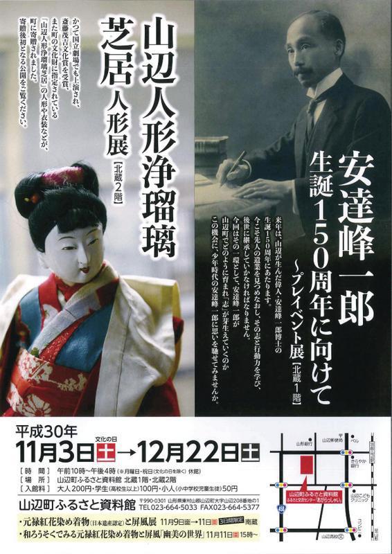 山辺町が生んだ偉人・安達峰一郎博士は、第1次世界大戦の前後に外交官として世界平和のために尽力し、「世界の良心」とうたわれています。来年は生誕150周年にあたります。そのプレイベント展として、ふるさと資料館北蔵1階にて、安達峰一郎博士の幼少時代を中心に、貴重な資料や写真等を展示しています。また、北蔵2階では、町の文化財に指定されている「山辺人形浄瑠璃芝居」の人形や衣装の数々を展示しています。この機会にぜひご覧ください。 「安達峰一郎生誕150周年に向けて」「山辺人形浄瑠璃芝居人形展」 日 時・・ 平成30年11月3日(土)〜12月22日(土) ※月曜・祝日休館 時 間・・ 午前10時〜午後4時 場 所・・ ふるさと資料館北蔵1階・北蔵2階 入館料 ・・ 大人200円・学生(高校生以上)100円・小人(小中学校児童生徒)50円 お問い合わせ先・・山辺町ふるさと資料館 [TEL」023−664−5033