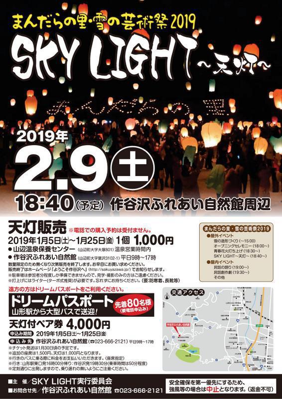 まんだらの里・作谷沢の冬のイベント「雪の芸術祭2019」を開催します。一面銀世界となる作谷沢ふれあい自然館にて様々なイベントが行われます。屋外イベントとして天灯(スカイランタン)の打ち上げを行います。作谷沢の澄んだ夜空に、一緒に天灯を打ち上げる参加者を募集します!色とりどりの天灯が空一面に浮かび上がり幻想的な世界が広がります。ご友人やご家族、大切な人と一緒に願いを込めて天灯を打ち上げてみませんか!! また、山形駅から送迎付きの「ドリームパスポート」を販売します。雪道の運転に不安な方や、交通手段が無い方からも安心してご参加いただけます。 『雪の芸術祭2019』☆開 催 日 2019年2月9日(土) オープニングセレモニー18:00〜 天灯打ち上げは18:40〜☆場 所 作谷沢ふれあい自然館☆参 加 費 天灯(スカイランタン)1個1,000円☆天灯販売 2019年1月5(金)〜1月25日(金) 山辺温泉保養センター (温泉営業時間内) 作谷沢ふれあい自然館 (平日9時〜17時) ※数量限定のため無くなり次第終了します。お早目にお買い求めください。 ※打上げにはライター(ターボ式推奨)が必要です。忘れずにお持ちください。『ドリームパスポート』 点灯付ペア券 4,000円 ☆申込み期間 2019年1月5日(金)〜1月25日(金) ☆申込み先 作谷沢ふれあい自然館 TEL023-666-2121(平日9時〜17時) ※先着80名様限定になります。(要電話申込み) ※行き:山形駅東口発16:00、帰り:作谷沢発19:30(座席指定) ☆お問合せ先 作谷沢ふれあい自然館 山辺町大字簗沢3102−1 TEL 023−666−2121