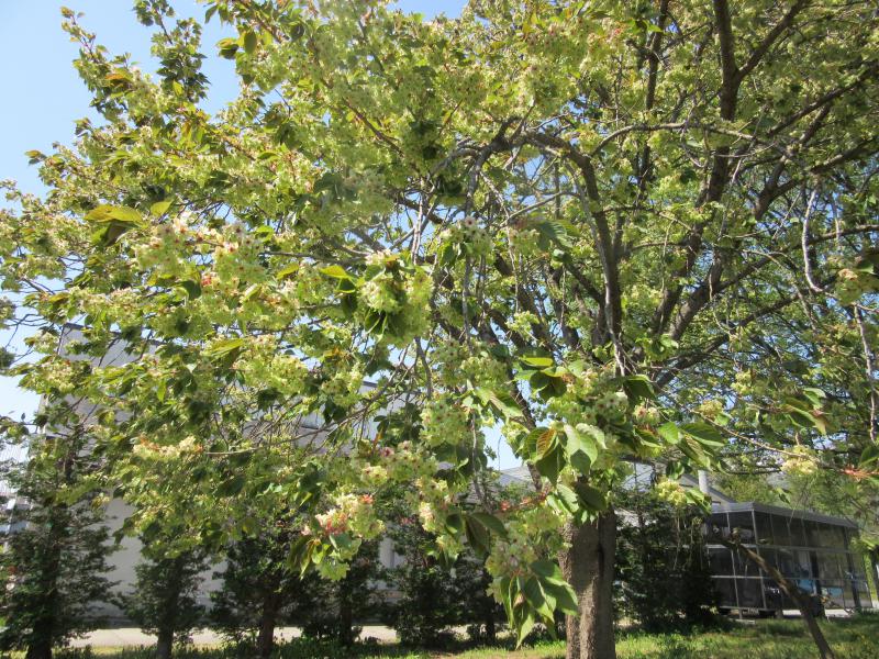 ゴールデンウイークも終わり、古典桜は、すべて葉桜となりましたが、蚕桑地区コミュニティーセンター前、八重咲きの「御衣黄(ぎょいこう)」が4月末から咲きはじめ現在ちょうど見頃をむかえています。古典桜より約1〜2週間ほど遅れて開花する八重咲きの黄緑色の桜で、古くから知られる珍しい花色の桜です。ぜひ見においでください。