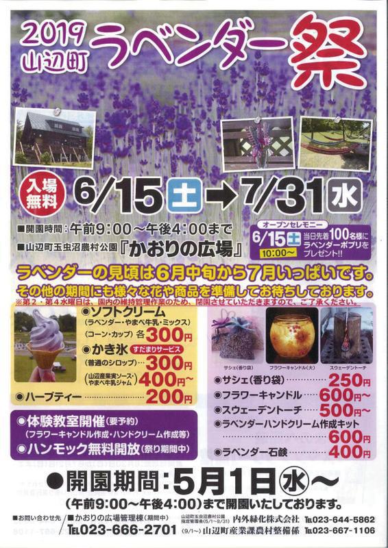6月15日(土)より、山辺町玉虫沼農村公園「かおりの広場」にて、“ラベンダー祭”が始まります。山辺町の山間部にある「かおりの広場」は、約3000株のラベンダーが咲き誇り、澄んだ空気とラベンダーの香りにつつまれます。ラベンダーの見頃は6月中旬頃からとなりますが、その他様々な花々をご覧いただけます。祭り期間中は、大人気のラベンダーソフトクリームや、ご当地ソフトクリームの「やまべ牛乳」味を販売するほか、山辺産果実ソースを使ったかき氷等がお楽しみいただけます。また、ラベンダー関連グッズの販売やフラワーキャンドル作成等の体験教室が開催されます。また、6月15日(土)はオープニングセレモニーを開催。午前10時より、先着100名様にラベンダーポプリをプレゼントいたします! なお、第2・第4水曜日は、園内の維持管理作業のため閉園とさせていただきますのでご了承ください。 2019山辺町『ラベンダー祭』□開催期間 2019年6月15日(土)〜7月31日(水) ※第2・第4水曜日は閉園□開催場所 山辺町玉虫沼農村公園『かおりの広場』□開催時間 午前9時〜午後4時□お問合せ先 内外緑化株式会社 【TEL】023−644−5862