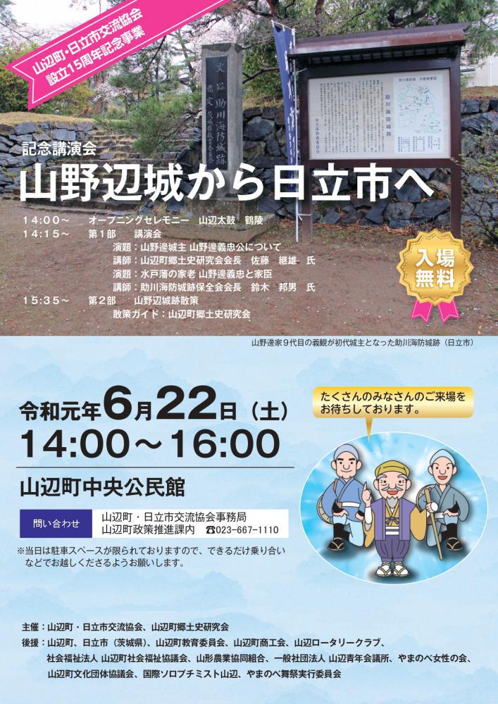 友好都市・茨城県日立市との交流をお互いの市民・町民で進め、交流の輪を広げていくことを目的として設立された「山辺町・日立市交流協会」が、設立15周年を迎えました。これを記念して、友好都市提携のきっかけとなった歴史的なつながりをテーマに記念講演会を開催します。入場無料です。□日時/6月22日(土) 14:00〜16:00□場所/山辺町中央公民館▼オープニングセレモニー(14:00〜) 出演…山辺太鼓 鶴陵▼記念講演会(14:15〜) @山野辺城主 山野辺義忠公について 講師…佐藤継雄さん(山辺町郷土史研究会 会長) A水戸藩の家老 山野辺義忠と家臣 講師…鈴木邦男さん(助川海防城跡保全会 会長)▼山野辺城跡散策(15:35〜) 山野辺城址碑や旧山野辺陣屋玄関などの散策 ガイド…山辺町郷土史研究会※駐車スペースに限りがあります。できるだけ乗り合いなどでお越しくださるようお願いします。□お問合せ先 山辺町・日立市交流協会事務局 (政策推進課 総合戦略係内)【TEL】023(667)1110