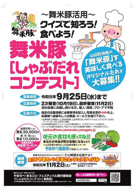11月2日に行われる「第11回やまのべ・まるごと・フェスティバル」において、今年度は舞米豚【しゃぶだれコンテスト】を開催します。山辺町の特産品である「舞米豚」をしゃぶしゃぶにした時に合わせる「たれ」のレシピを募集します。舞米豚をおいしく食べるオリジナルのレシピをお待ちしております!! ・応募期間 令和元年9月25日(水)まで・応募資格 2次審査(10月19日)、最終審査(11月2日)当日会場にお越し頂ける方。 個人・団体、プロ・アマ不問・応募方法 指定の応募用紙に必要事項を記入し、料理の写真を添付のうえ、応募箱に投函又 は郵送、Eメールでご応募下さい。 [郵 送 先] 〒990-0392 山形県東村山郡山辺町緑ケ丘5 やまのべ・まるごと・フェスティバル実行委員会 「しゃぶだれコンテスト」事務局 (山辺町役場産業課商工観光係内) [E‐mail] kankou@town.yamanobe.yamagata.jp※応募用紙、応募箱は役場産業課、町商工会、ショッピングプラザベル、スーパーおーばん山辺店の設置しております。応募要項 舞米豚【しゃぶだれ コンテスト 】募集要項(PDFファイル)応募用紙 舞米豚【しゃぶだれコンテスト】応募用紙(Wordファイル) [お問合せ] やまのべ・まるごと・フェスティバル実行委員会 「しゃぶだれコンテスト」事務局 (山辺町産業課商工観光係内) TEL:023-667-1106 FAX:023-667-1108