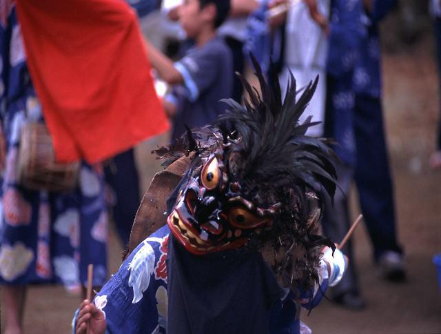 1人立ちの獅子3人で踊る素朴で勇壮な踊りで8月15日夜を徹して踊る。