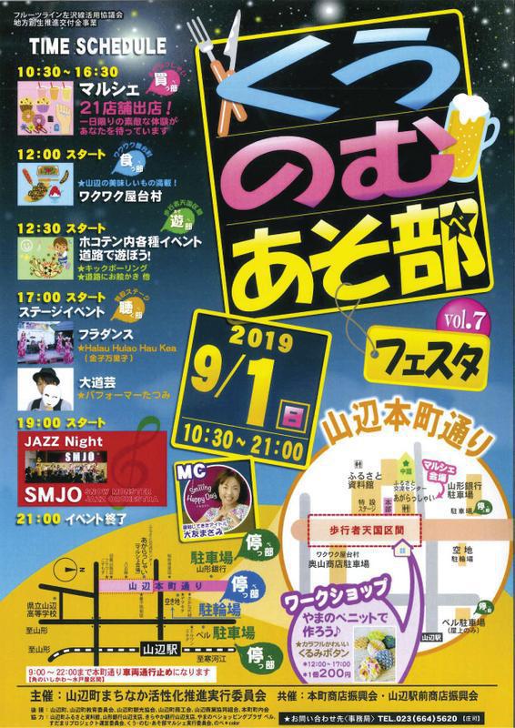 今年で7回目となる「くう・のむ・あそ部(べ)」フェスタを9月1日(日)に本町通りにて開催します。本町通りの一部が歩行者天国になり、道路にお絵かきや、キックボーリング等普段では遊べない道路でおもいっきり遊べます(^o^)/ステージイベントが開催されるほか、山辺のおいしい物の屋台や、マルシェも開かれます♪9月1日は山辺町で食べて、飲んで、遊んで、楽しい時間を過ごしにきてください!! 「くう・のむ・あそ部(べ)フェスタ」vol.7□日 時 2019年9月1日(日)□時 間 10:30〜21:00□場 所 山辺本町通り□スケジュール 10:30〜16:30 マルシェ 12:00〜 屋台村 12:30〜 道路で遊ぼう! 17:00〜 ステージイベント 21:00 イベント終了□主 催 山辺町まちなか活性化推進実行委員会□お問合せ先 事務局 TEL:023−664−5620