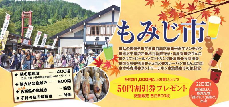 今年の白鷹鮎まつりは、多くの方に鮎をお楽しみいただくため駐車場台数を昨年より多く確保して渋滞緩和に努めています。今回は、ステージイベントではなく、新たなお楽しみを増やして子供から大人まで楽しめるイベントをたくさんご用意しております。今回新たに数量限定各日500枚「もみじ市」で使える各店舗1000円以上お買い上げで50円割引券をプレゼントいたします。
