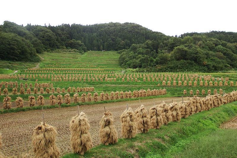 9月24日現在の大蕨の棚田は、稲刈りもほぼ終わりずらりと稲ぐいが立ち並んでいます。稲を天日干しする杭掛け作業は、手作業で行う大変さから今ではあまり見られない風景となりました。 黄金色の稲ぐいが規則正しく立ち並んでいる『大蕨の棚田』は、日本の原風景を感じさせてくれます。杭掛け風景は10月の第2週頃まで見ることができます。
